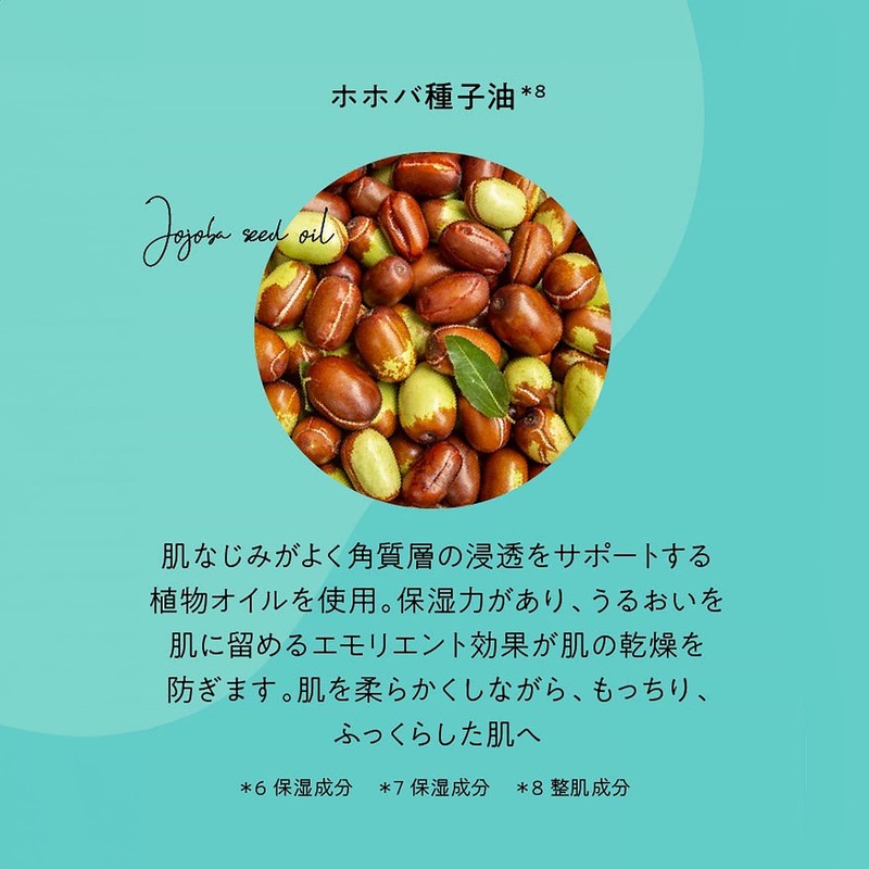 【うるおいチャージ】セラミド×ヒアルロン酸。乾燥した肌に水分チャージ。うるおいを閉じ込めてしっとりなめらか肌へ。ホホバ種子油。肌なじみがよく角質層の浸透をサポートする植物オイルを使用。保湿力があり、うるおいを肌に留めるエモリエント効果が肌の乾燥を防ぎます。肌を柔らかくしながら、もっちり、ふっくらした肌へ。