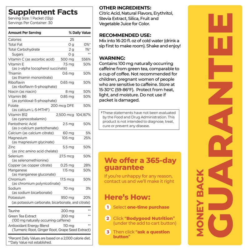 • Guilt free energy with B12 + natural green tea. Powerful, clean energy fueled by B12 and 100 mg of natural green tea caffeine. Never feel those jitters that you have to cope with from other dirty energy sources.