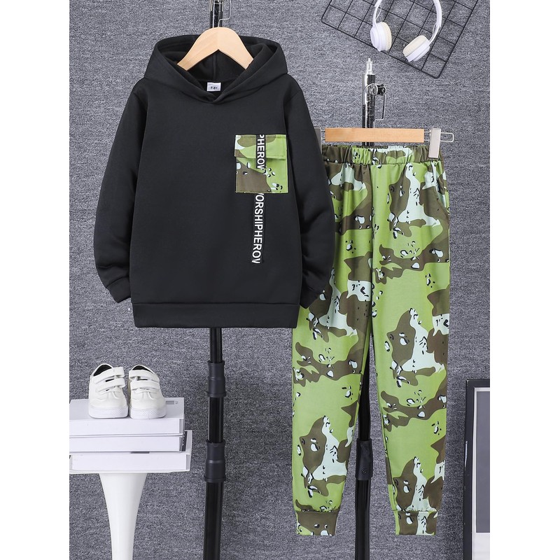 - Design:This boys 2pcs pant sets includes a long sleeve hoodie with a camouflage-print chest pocket and matching a full camouflage design pants . The elastic waistband ensures a comfortable fit, while the hooded pullover adds a stylish streetwear look. Perfect for big kids who love casual fashion outfits.