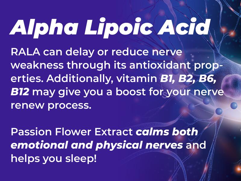 • Ingredients: Targets Neuropathy & Nerve Regeneration,Natural & Bioactive Compounds,Mitochondrial Support Enzymes,Glutathione Precursors,Alpha Lipoic Acid