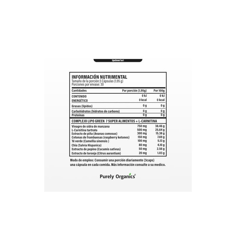 🌟 ⭐ Purely Organics | LipoGreen 7 en 1 | Vinagre de Manzana, L-Carnitina y Extractos Naturales | 90 Cápsulas ⭐ 🌟