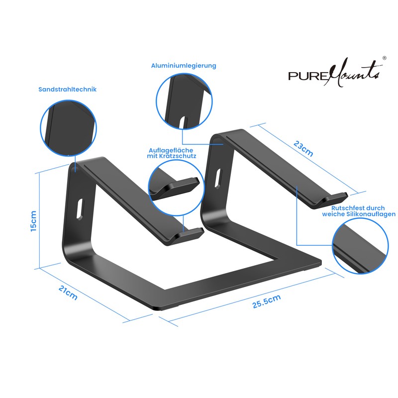 - Universally suitable for laptops from 11 to 17 inch: with a load capacity of up to 5 kg and the dimensions 255 x 230 x 150 mm, the PureMounts universal laptop stand is ideal for devices of different brands and sizes.