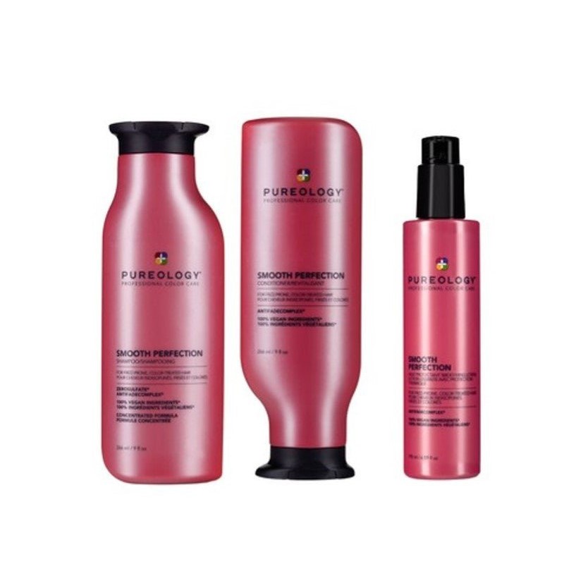 The Pureology Smooth Perfection Trio Bundle includes a concentrated smoothing shampoo, a concentrated daily conditioner, and a smoothing lotion that control frizz and fly-aways while protecting against heat for fine to normal, frizzy, and color-treated hair.