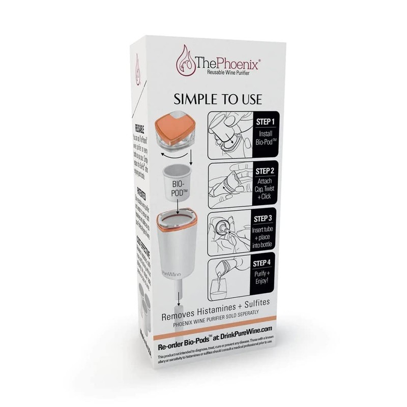- ENJOY – The Bio-Pod Cartridges should be used in combination with The Phoenix Reusable Wine Purifier & Aerator. One Bio-Pod purifies ONE bottle of wine and reduces ALL of the most common side effects from wine: Stuffy Nose, Skin Flush, and Upset Stomach.
