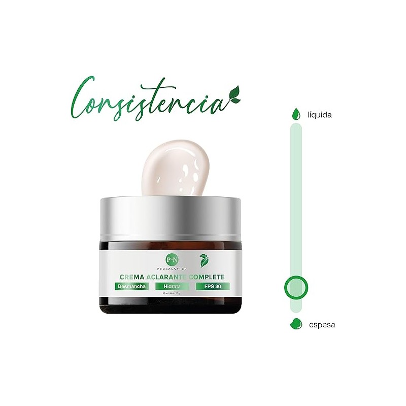 - PIEL SIN MANCHAS Y LUMINOSA: La Crema aclarante complete te ayuda a reducir los daños causados por el sol, la edad y la deshidratación, devolviéndole a la piel su brillo y tono natural, dejando las áreas faciales, corporales y manos libes de manchas e imperfecciones. Además de ser hidratante y proteger de los rayos solares. Gracias a su alto contenido de activos como el ácido hialurónico, la niacinamida, el ácido glicólico y FPS 30.