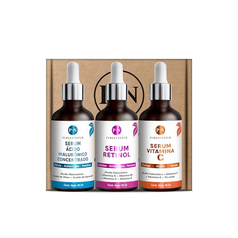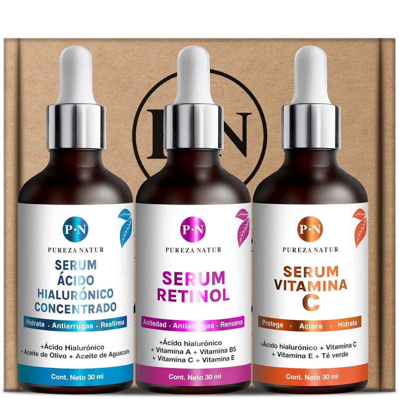 PUREZA NATUR Kit Serum facial Acido Hialurnico, Vitamina C y Retinol anti edad Paquete completo de serum para el cuidado de la piel, hidratacin y...
