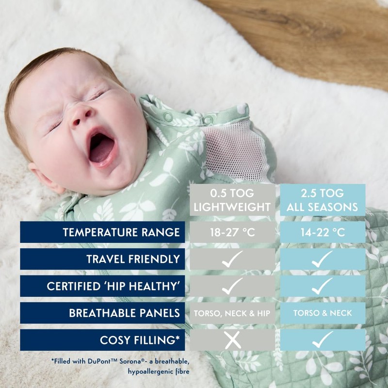 - Breathable Panels - Provide essential ventilation and increased airflow to keep baby at a regulated and safe temperature especially while wrapped up. Our panels are strategically located to provide maximum comfort to commonly over-heated areas on babies including the torso and lower neck. Use our What to Wear Guide to find the best sleepwear for your infant while using in swaddle or sleep bag mode.