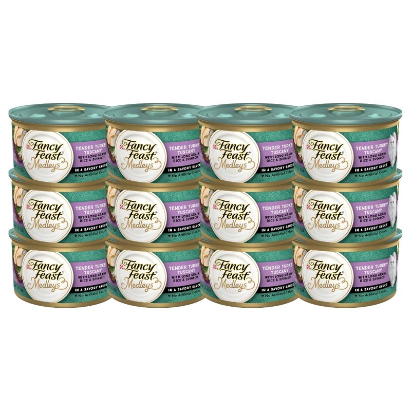 - Twelve (12) 3 oz. Cans - Purina Fancy Feast Medleys Tender Turkey Tuscany with Long Grain Rice and Spinach in a Savory Sauce - 3 oz. Can