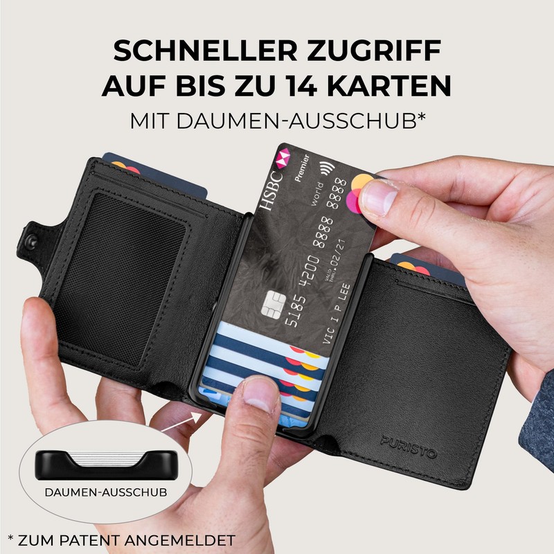 - Quick card selection – the innovative credit card holder allows you to quickly slide the cards. No spring/lever mechanism that breaks. Quick access to the right card. Holds up to 14 cards