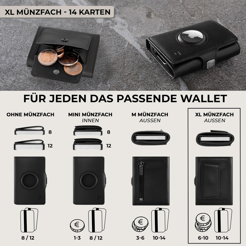 - Quick access to notes and coins – with full-fledged note compartment made of premium genuine leather. No more cumbersome folding. The small coin compartment does not take up card space and opens easily without coins falling out.