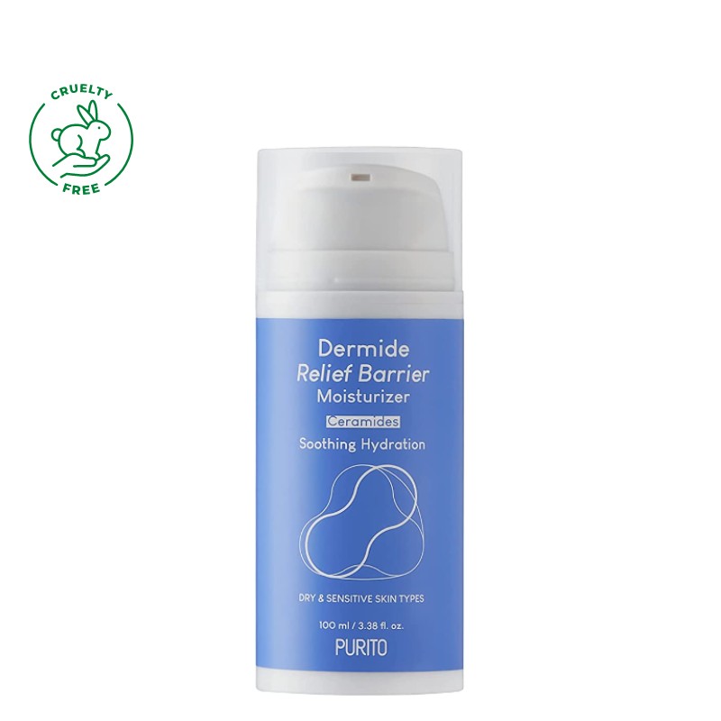 🌸 PURITO Dermide Relief Barrier Moisturizer is a skin-relieving moisturizer formulated with five different types of ceramides (5,000ppm) to help reduce redness and support the weakened skin barrier by providing soothing and calming properties.