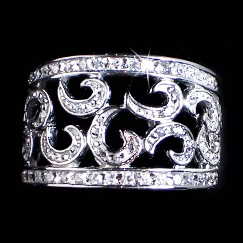 Pave' Swirl cut-outs... Brilliant Wide CZ Wedding Band or Right Hand ring. The dainty pave' swirls give this ring a more modern contemporary look...Absolutely GORGEOUS! This ring looks so good it's impossible to distinguish between these and real ones costing thousands of dollars. The photos do not capture the true beauty of this ring. A beautiful Classic ring that will never go out of style. |