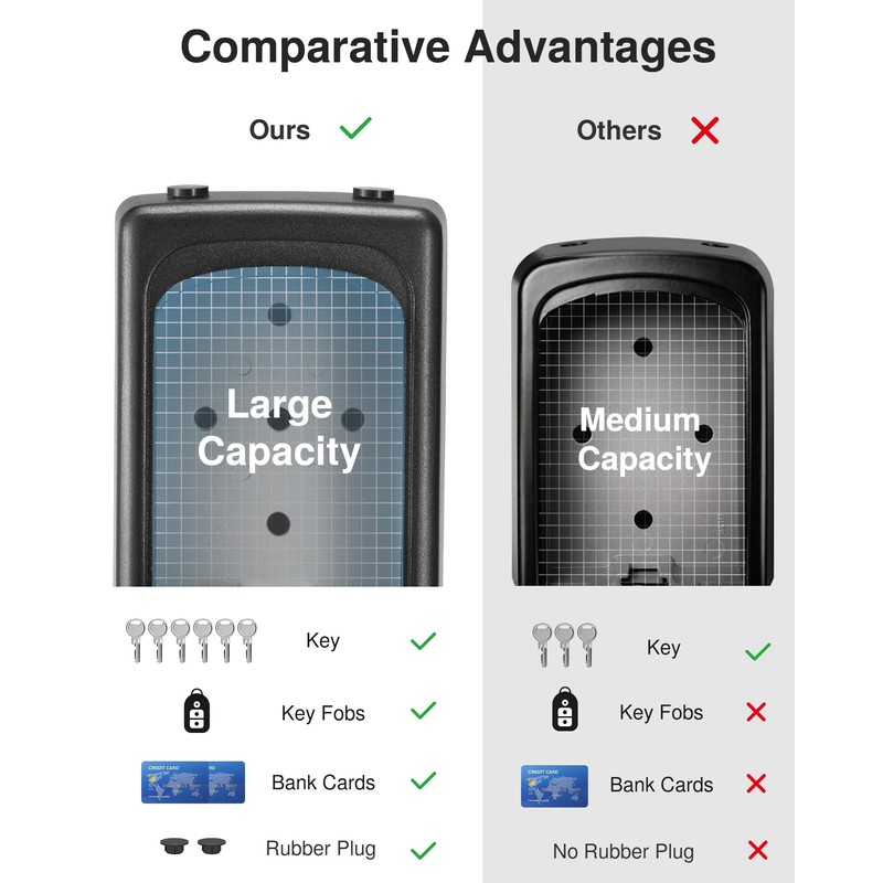 • Large Capacity: The key lock box has ample internal storage space for safely storing your house keys. You can put your keys in the lockbox for emergency entry when you go for business or a trip. No need to worry about forgetting to bring the key.