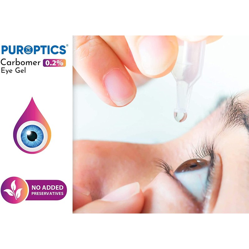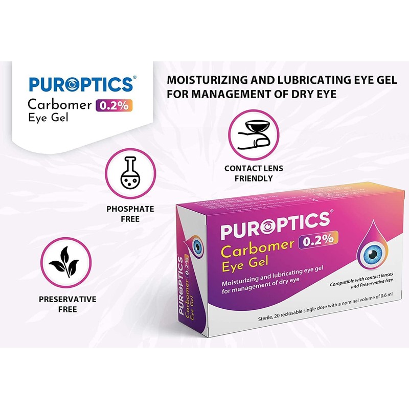 - PUROPTICS Carbomer 0.2% Eye Gel compensates for tear insufficiency relieves the symptoms of irritation linked with dry eye syndromes and protects the cornea against the drying out.