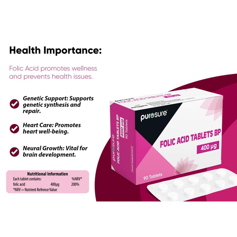 - Contain Pure Natural Folic Acid Ingredients: Purosure Folic Acid 400 mcg Tablets act as an instant dose of Vitamin B9 and Folic Acid and Contain no synthetic fillers or binders, only using high quality ingredients