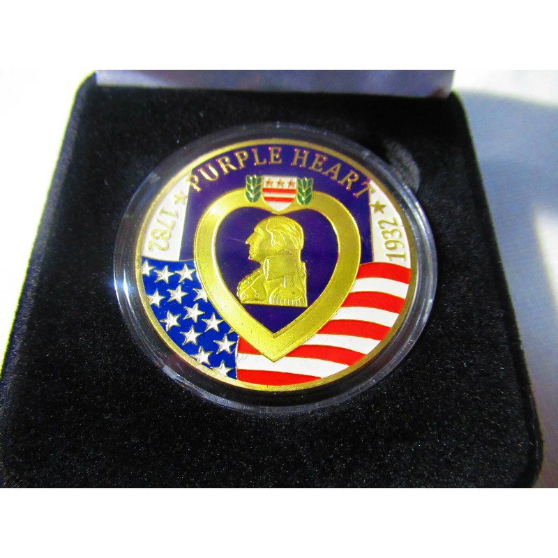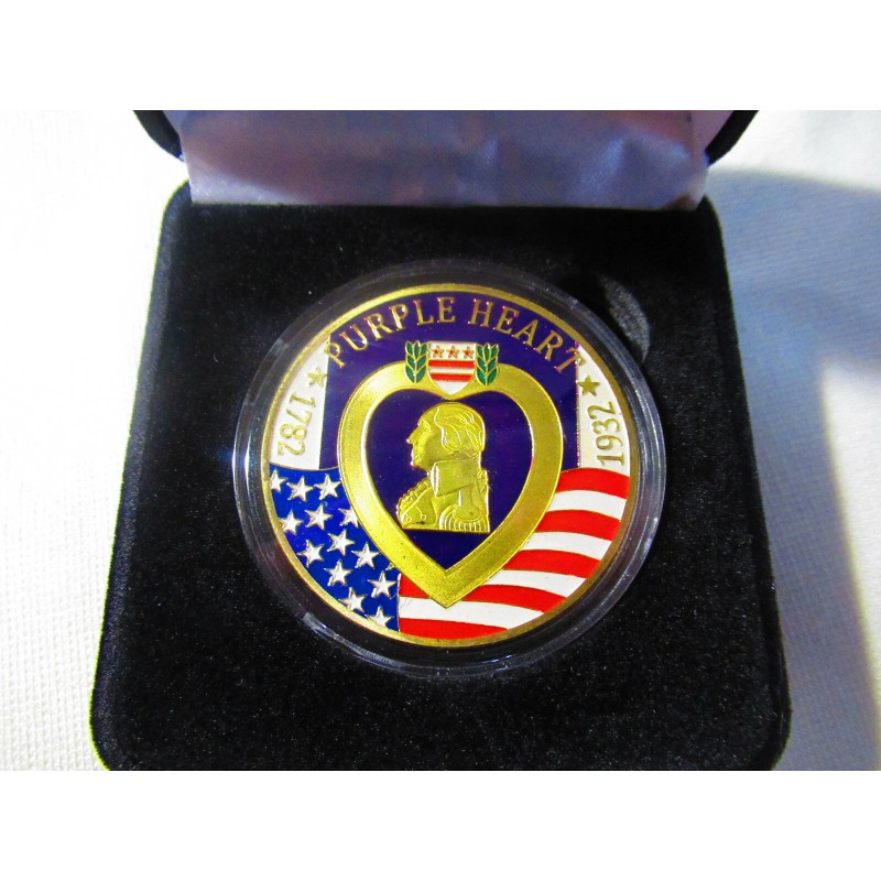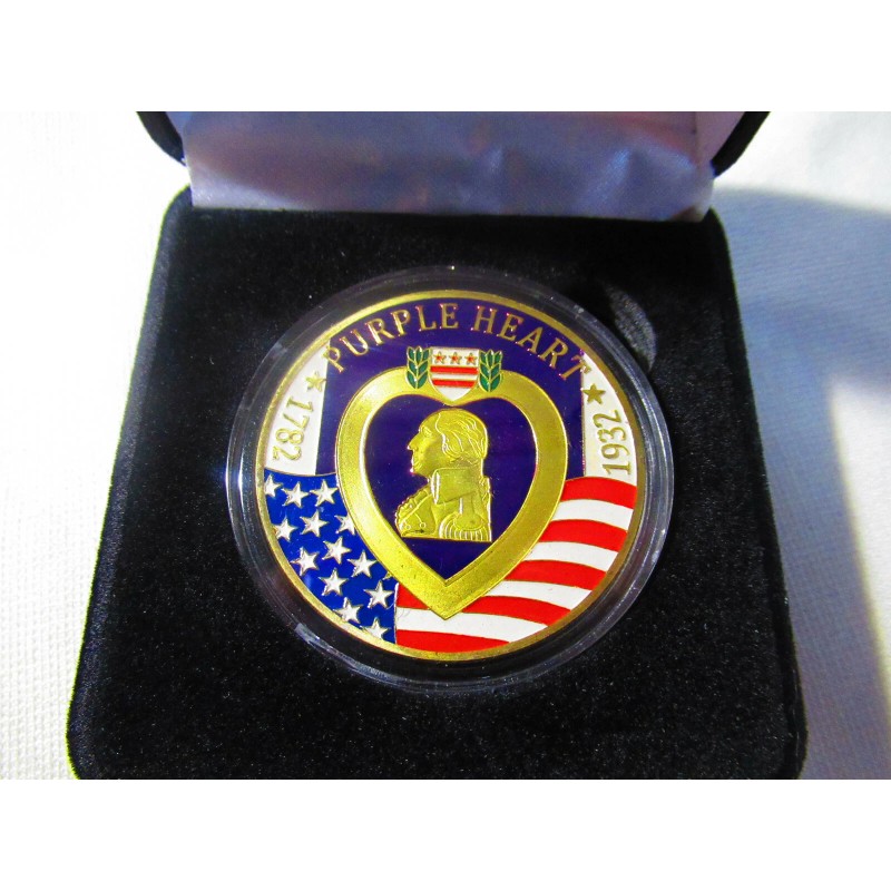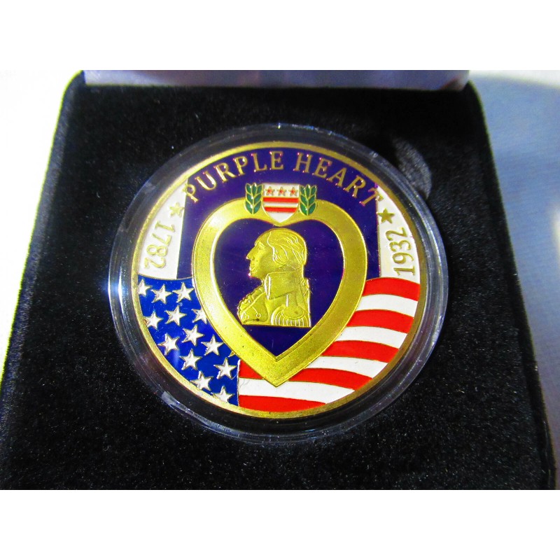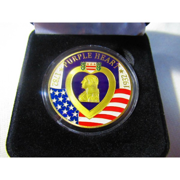 This is a great tribute to our Purple Heart Recipients. This Purple Heart challenge coin is meant to be presented to a Purple Heart recipient. Coin has reeded edges and is about 1 9/16" in diameter. All details are raised lettering. Coin is contained in an acrylic air tight holder and displayed in an attractive black velvet presentation box which will make this a very impressive gift.