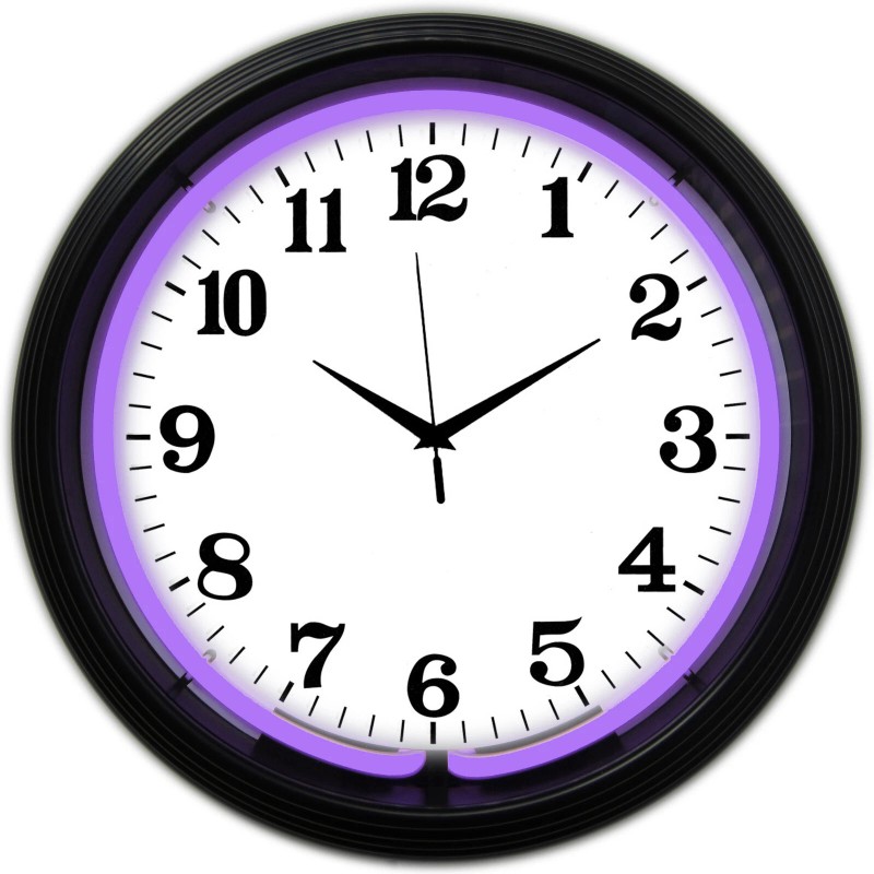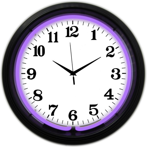Black matte finished multi tiered rim houses one beautiful real Purple neon hand blown glass neon tube that accentuates a quartz clock . Brand New! Comes Ready to Hang in your Kitchen or Game room or office or garage. Note.. Some folks call this Lavender but I think it looks more purple. Anyways it is the nearest thing neon glass has to purple
