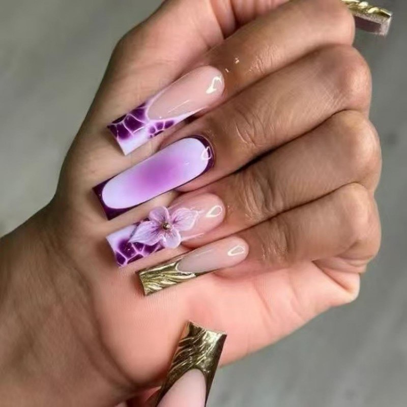 - Easy to Use:Choose the suitable purple flower press on nails, polish the nail bed, paste the jelly glue, press the fashion nail art in 30 seconds, and create the nail art that girls like. If the full cover artificial nails size is not suitable, it can be polished to the size of the nail cap with a friction tool. They are easy to apply and remove. No special nail polish remover is required; only hot water is needed