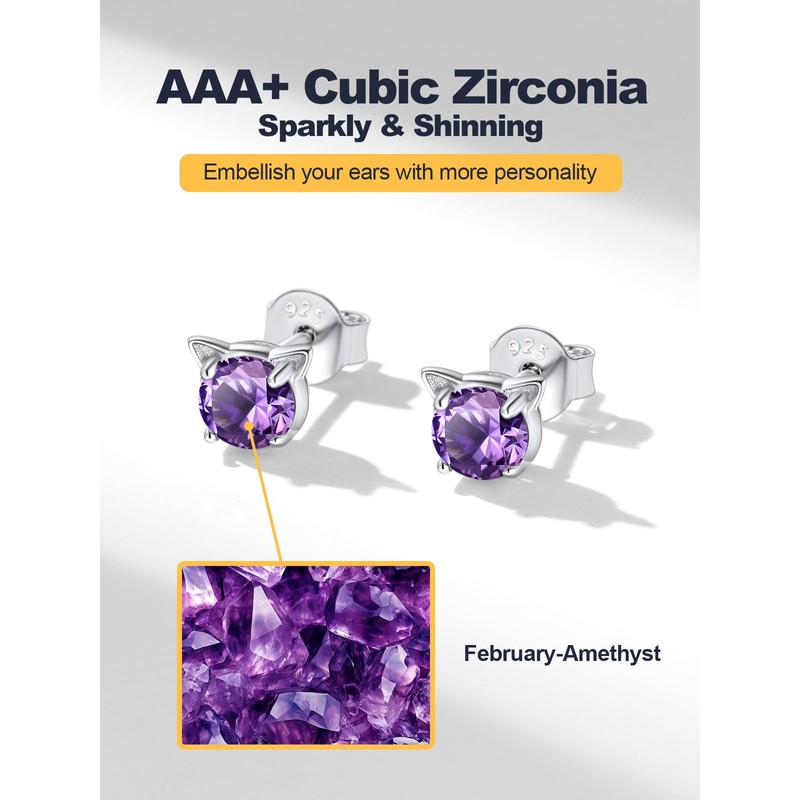 Purple Stud Earrings Sterling Silver Hypoallergenic Cute Cat Studs February Birthstone Amethyst Crystal Earrings for Women