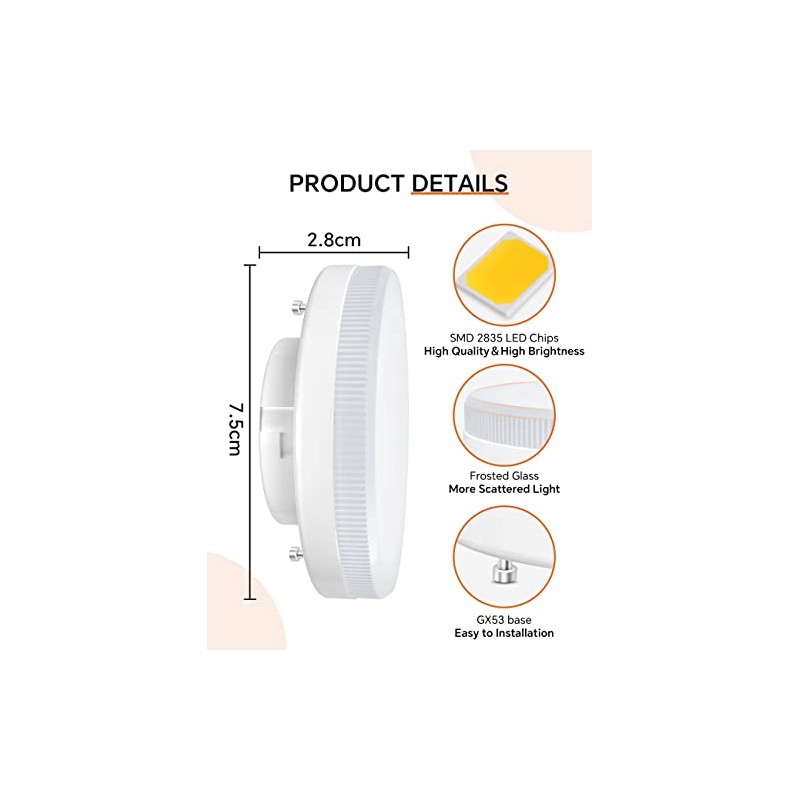 • Long Lifespan GX53 LED Light: 30,000 Hours, very low power consumption, GX53 pin socket, 120 Beam Angle, warm white,3000k (CRI 80)