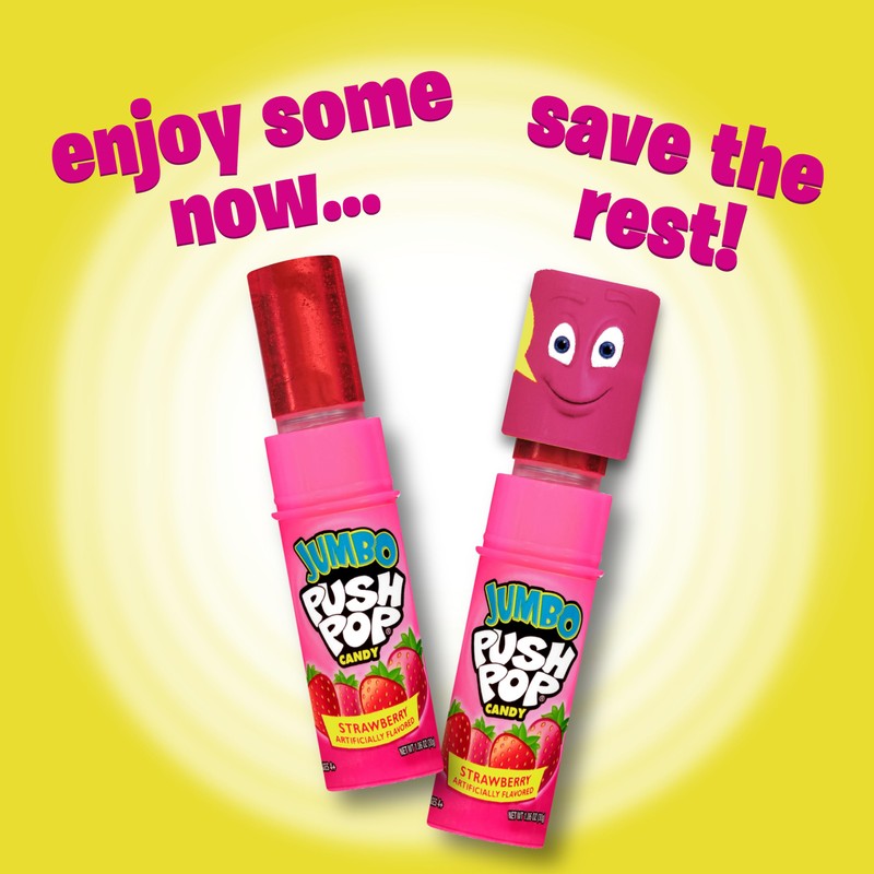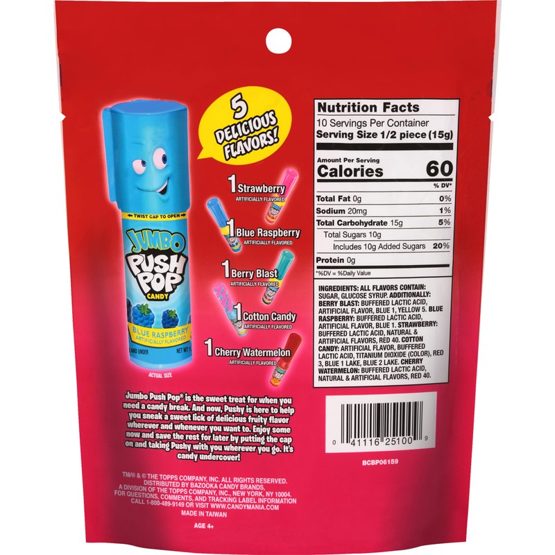 In need of a candy break? Grab a Jumbo Push Pop! Jumbo Push Pop is a super-sized delicious and simple lollipop that is spring-loaded to deliver intense flavor action to your mouth. Each one comes in a rugged plastic case that has a cap with a clip so you can easily bring it with you anywhere. Eat some now and save the rest for later - wherever you go! Box includes 5 1.06 Oz Jumbo Push Pop lollipops in 4 assorted flavors - Strawberry, Blue Raspberry, Berry Blast, and Cherry Watermelon. Make your candy break start now! Disclaimer: Not for children 3 and under.