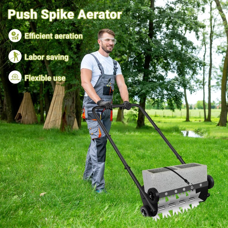 This heavy-duty manual lawn aerator is perfect for aerating your yard. With 18-inch spikes that easily penetrate soil and four rolling wheels for easy maneuvering, it efficiently relieves soil compaction for healthier grass growth. The 45-inch handle provides excellent leverage to insert and remove the solid steel spikes. Light enough for one person to use yet durable enough for larger lawns, this aerator saves your back while improving your soil. By creating hundreds of holes that allow air, water and nutrients to reach root zones, your lawn will green up quickly after aeration. So grab this top-rated aerator and give your yard the TLC it needs to thrive throughout the seasons.
