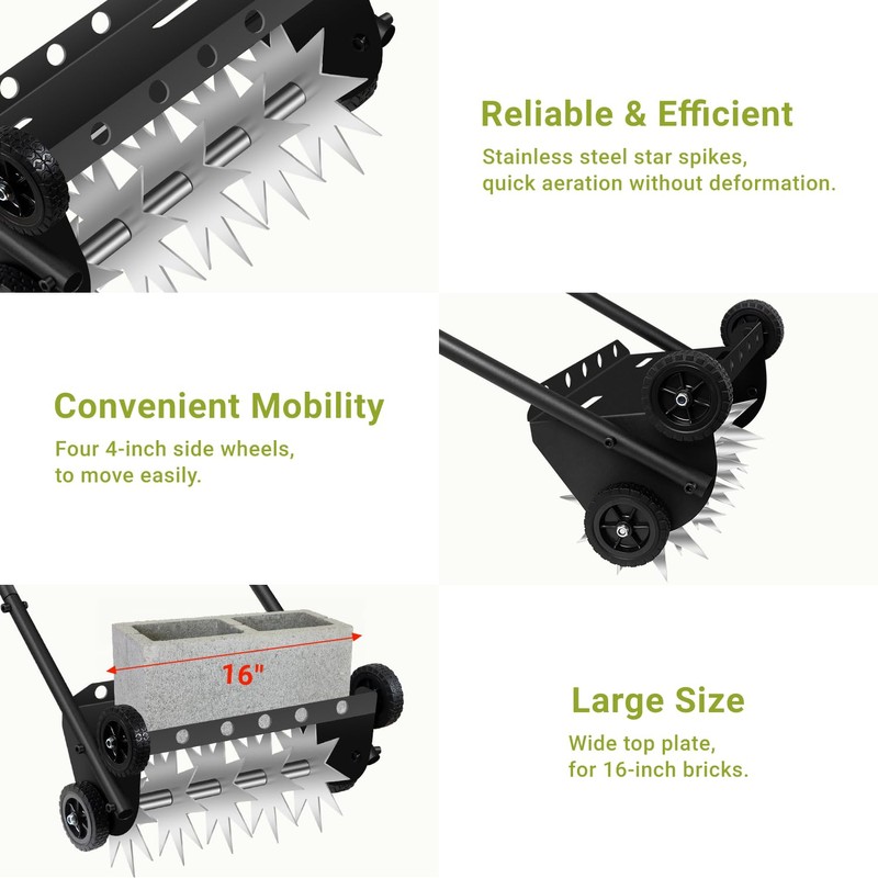 • UPGRADED DESIGN: Features an 18-inch width spike drum and four durable wheels for easy maneuvering across lawns. Aerates up to 2,500 square feet on a single charge.