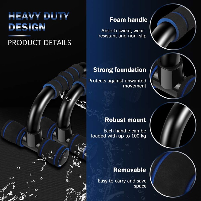 - H-Shaped Frame Design: Push up bar stands is designed in an H shape with excellent stability, specially designed tilt angle, helps to reduce strain on your wrists, helping you perform more effective pushups without wrist pain. Load capacity: 150kg.
