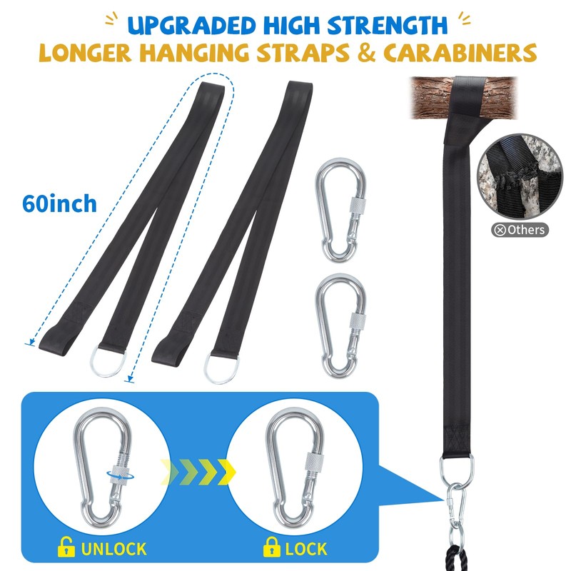 - 𝟐 𝐄𝐱𝐭𝐫𝐚 𝐑𝐞𝐢𝐧𝐟𝐨𝐫𝐜𝐞𝐝 𝐖𝐞𝐛𝐛𝐢𝐧𝐠 - 𝐀𝐧𝐭𝐢-𝐬𝐚𝐠𝐠𝐢𝐧𝐠! Premium high strength 3-ply 900D Marine-graded canvas + high density HDPE trampoline-graded mesh cloth seat is much more waterproof uv-reistant wear-resistant than others. Moreover, 2 2" wide webbings added at the bottom of the flying swing seat, like 2 strong hands, to better support kids & adults, avoid sagging in the middle after prolonged use, provide long-lasting comfortable sitting