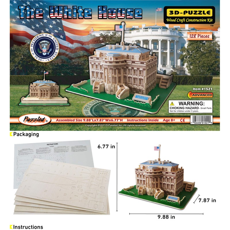 - INCLUDED WITH THE PURCHASE OF 3D THE WHITE HOUSE WOOD PUZZLE KIT - Includes 1 White House 3D Puzzle Wood Craft Construction Kit with 128 interlocking puzzle pieces, an instruction manual & 1 paper for sanding edges. 3D Puzzles never looked so good! The unfinished natural wood can be painted or colored for a more personalized look. In most parts no glue is needed & the pieces interlock together. The wooden puzzle approximate assembly size is 9.88''Lx7.87''Wx6.77''H. Paint & glue are not included.