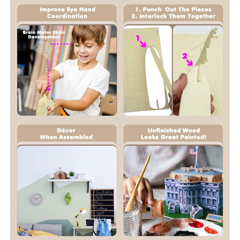 - IDEAL USE FOR THE WHITE HOUSE WOOD KIT 3D MODEL PUZZLE - Challenge yourself and your loved ones to build this DIY cut 3D puzzle, display your achievement as artwork or play with your new model toy. 3D puzzles woodcraft construction kits help develop skills like eye coordination, problem-solving & shape recognition, while encouraging creativity. Customize your landmark diy toy! Paint it for school projects or make it a game for friends and family to enjoy while spending quality time together.