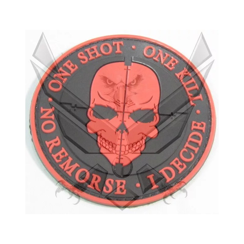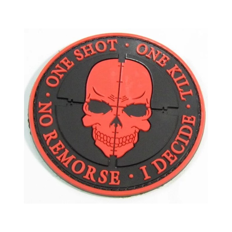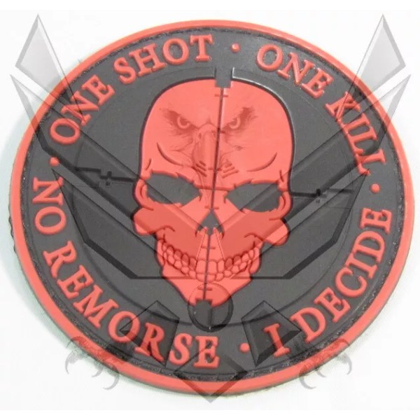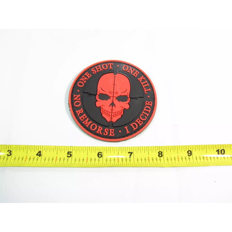 This is a PVC, Rubber, weather resistant, US Military sniper, red, 'One-Shot, One-Kill/No Remorse, I Decide', morale patch. This patch has the hook & loop backing. Please see our other military and morale patch listings. Please review the photos for the exact items you will be receiving and ask any questions prior to purchase.
