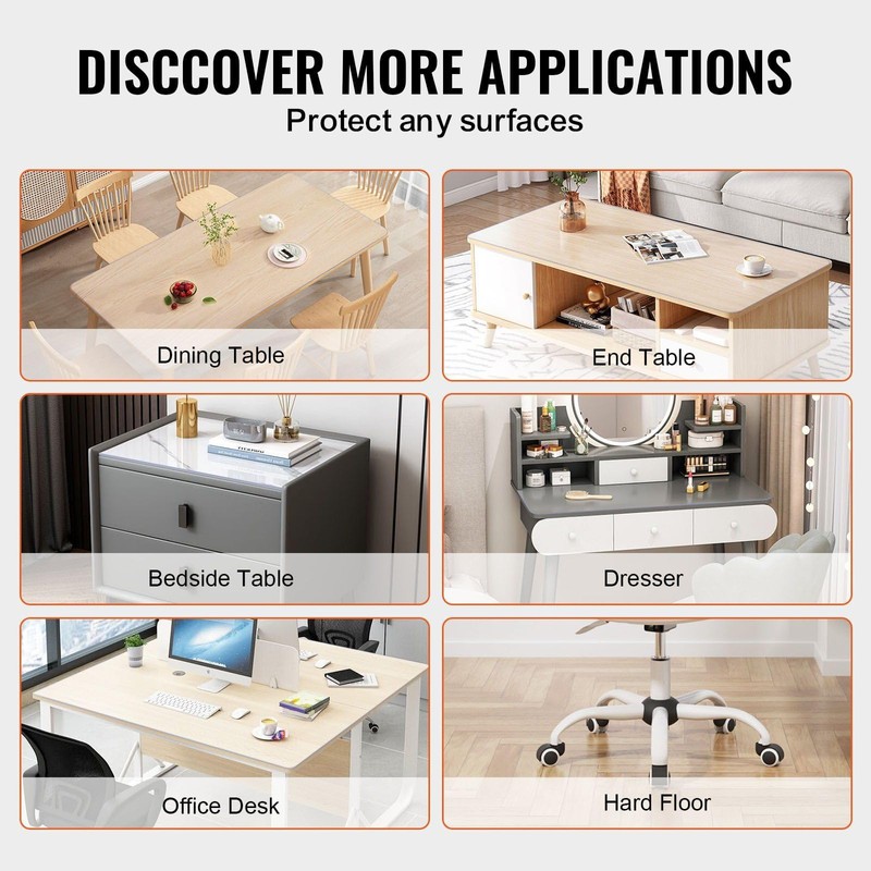 5.Versatile Applications: Our clear table cover protector can enhance a variety of environments, including homes, offices, restaurants, and event venues. They are suitable for wooden textured desktops such as dining tables, kitchen countertops, end tables, computer tables, dressers, TV cabinets, and more. Unlock limitless possibilities and enhance your experience!
