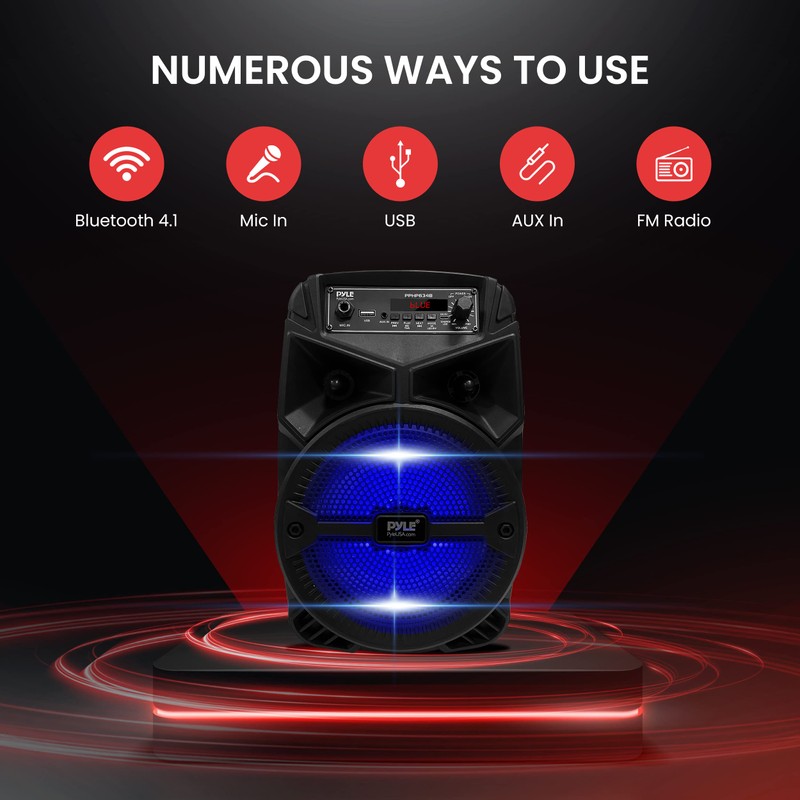 • 3 inputs: pyle bluetooth speaker karaoke pa system is equipped w/a usb flash drive reader so it can serve as an mp3 player, a 3.5mm aux input for connecting external devices & a 1/4” mic/guitar input. equipped w/fm radio with digital led display