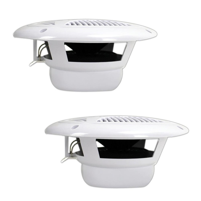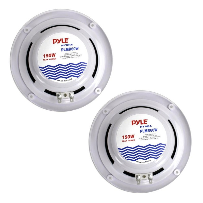 These white Pyle PLMR60W Hydra Series 6.5 in. 150 Watt Dual Cone Marine Speakers are waterproof and designed for use in your boat, on the dock, by the pool or simply mounted outside. They're designed with rustproof mesh covers for quality protection. The PLMR60W is a pair of 150 watt, 6.5 in. full-range speakers suitable for marine use. These white speakers are equipped with a polypropylene cone with cloth surround and 1 in. aluminum voice coil for accurate sound reproduction. The molded ABS plastic basket keeps your sound distortion-free.