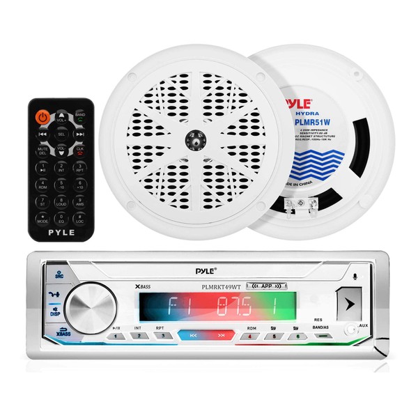 Pyle Bluetooth Marine Receiver Stereo & Speaker Kit - 300W Single DIN Boat Marine Head Unit, Mic, Hands-Free Calling, AUX, MP3/USB/SD, AM/FM Radio, Remote Control - PLMRKT49WT (White)