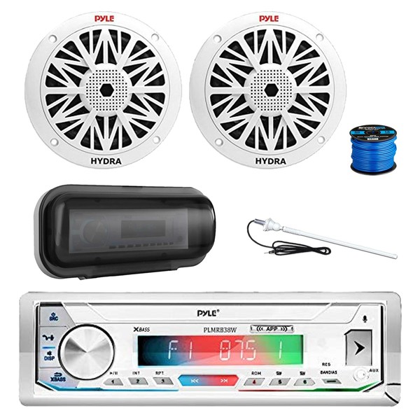 Pyle PLMRB39W Marine Single DIN Bluetooth AM/FM Stereo Receiver, Radio Cover, 2X 6.5 200 Watt Peak Full Range 2-Way Waterproof Audio Speakers w/Wire, Long Range Antenna