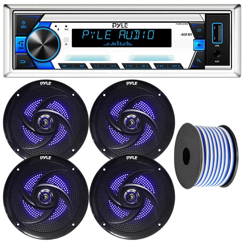 - PACKAGE BUNDLE INCLUDES: Pyle PLMRL50WB Single Din Bluetooth USB/AUX/MP3 Stereo Amplifier Receiver w/Remote, 2 Pair of Pyle PLMRS83BL 8" 300 Watt Marine Blue Light LED Speakers (Black) with Speaker Wire