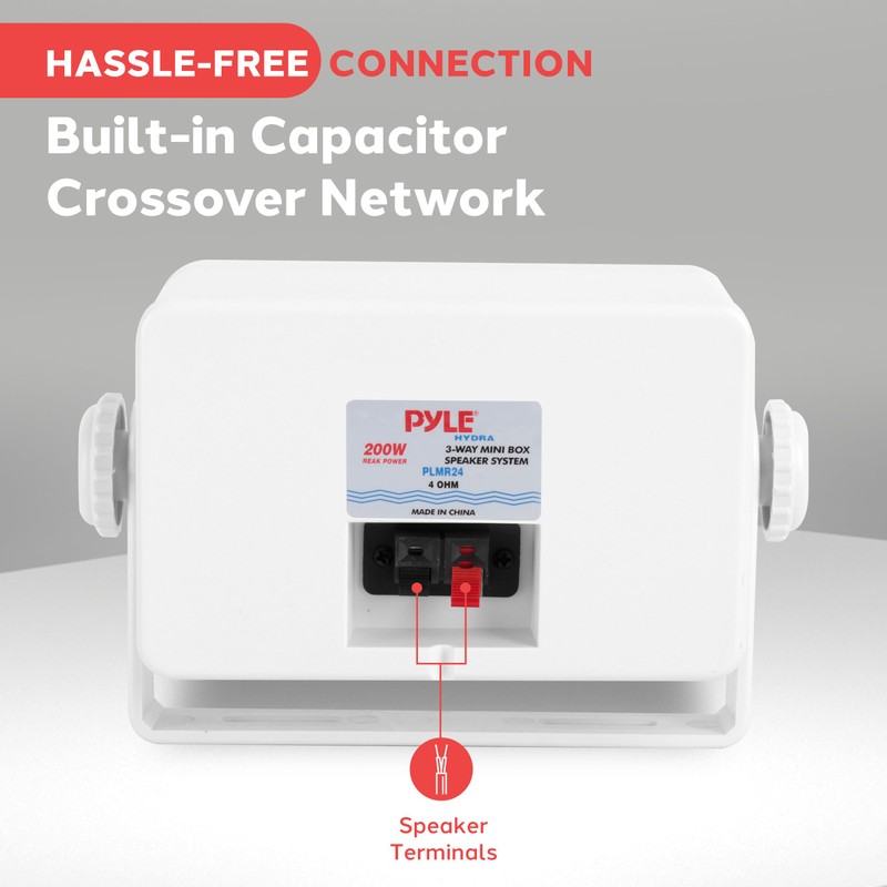 - AMPLIFY YOUR HOME: Pyle's 200-watt hydra marine speaker system is what you need to listen to high-quality audio on your boat, deck, poolside or outdoors! Includes 3.5 three-way outdoor mini box speaker and complete mounting kit wires