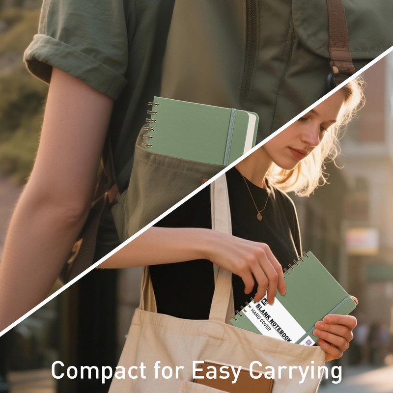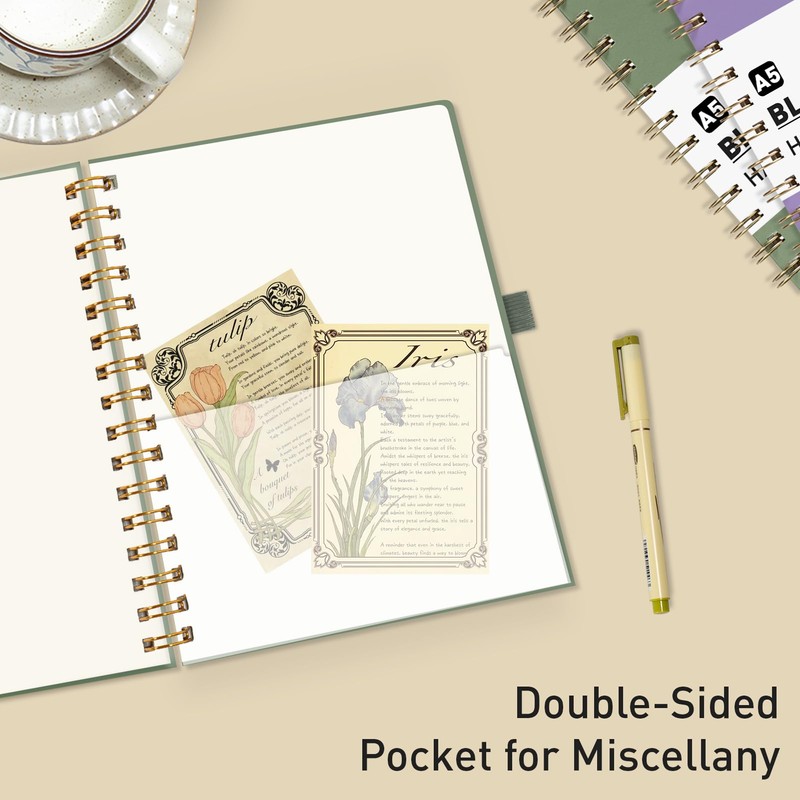 • Sturdy A5 Diary: with a cardboard cover and double spiral binding, featuring a knitted pen holder on the side, internal PVC pockets, and an elastic closure band to keep it closed when not in use—all finished in timeless Morandi Sage Green.