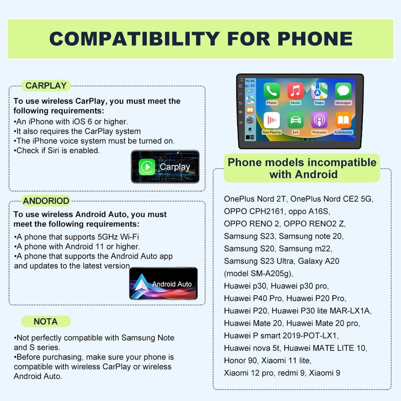 - ✅Support for CarPlay/Android Auto Wireless/MirrorLink: You can activate iOS CarPlay or Android Auto via a wired or wireless connection. With built-in voice recognition like Siri or Google Assistant, you can control navigation apps, music, messages, and calls directly from the screen without touching the device.