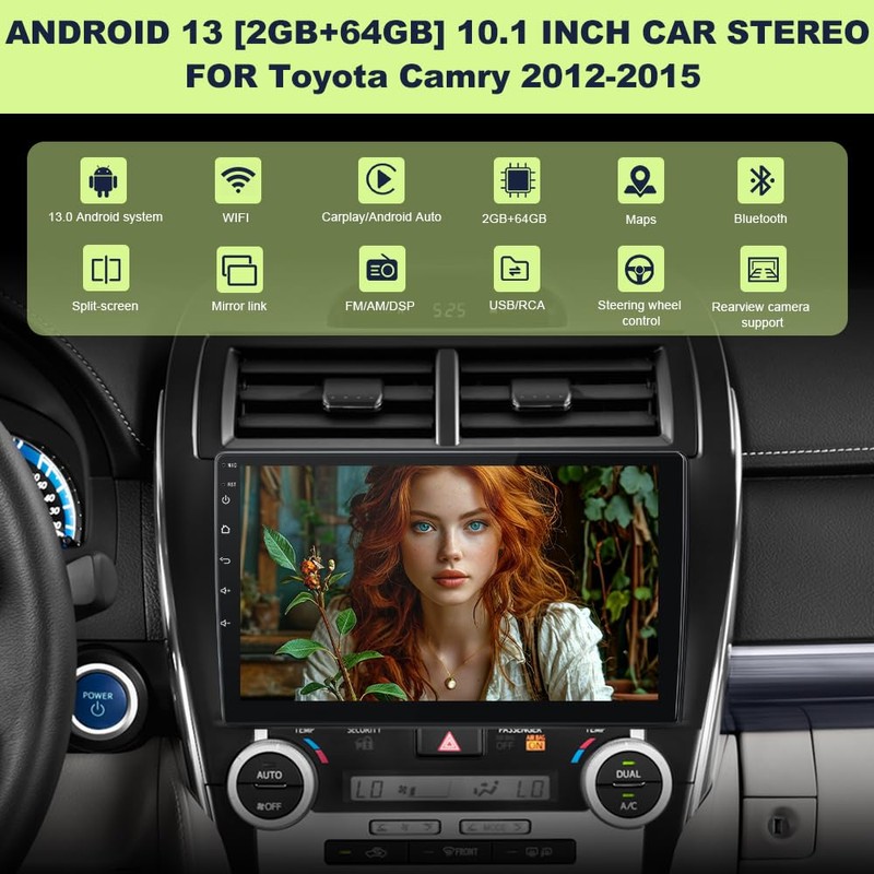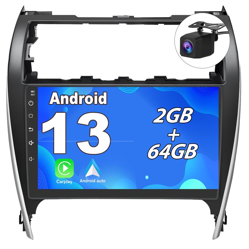 • ✅Android 13 Touchscreen for Toyota Camry 2012-2015: Equipped with the latest Android 13 operating system that guarantees maximum security, customization, and compatibility with over 3 million apps on Google Play. The combination of 2G 64GB allows you to run multiple apps simultaneously without lag. Bluetooth + Wi-Fi: Stream music via Bluetooth while downloading updates via Wi-Fi. Transform your dashboard into a smart entertainment center!