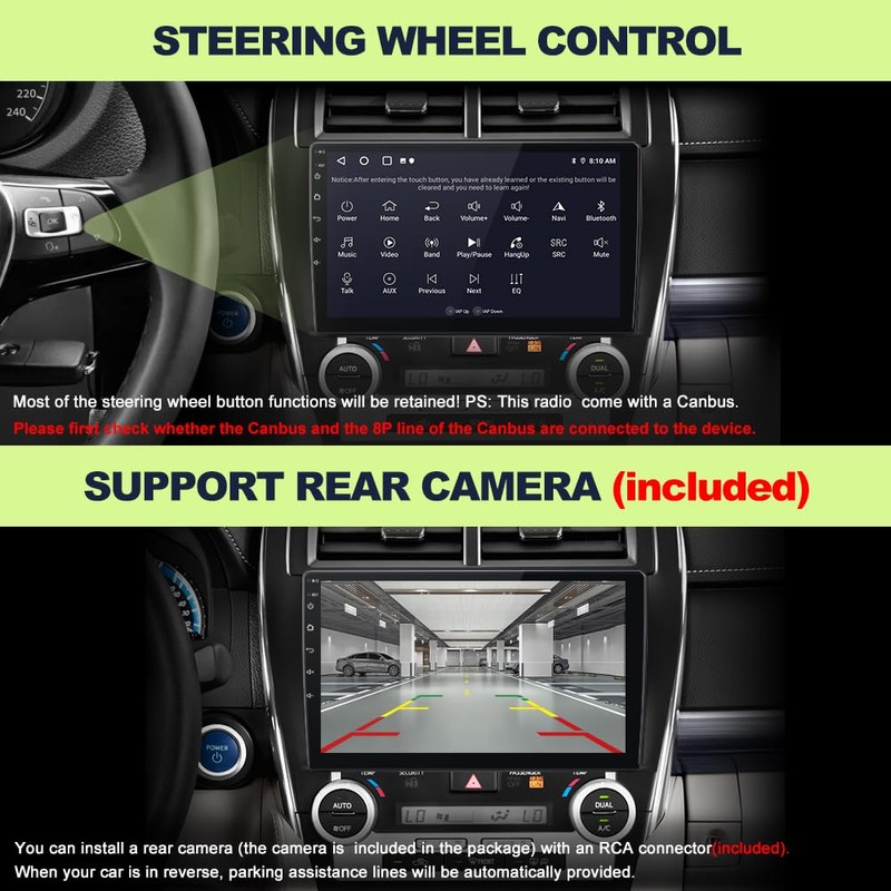 • ✅Reverse Assist: Connect an AHD720P/CVBS rear camera (included) via the RCA port. When reversing, guidance lines will be displayed on the screen. Compatible with original reversing radars (modified radars are not supported).