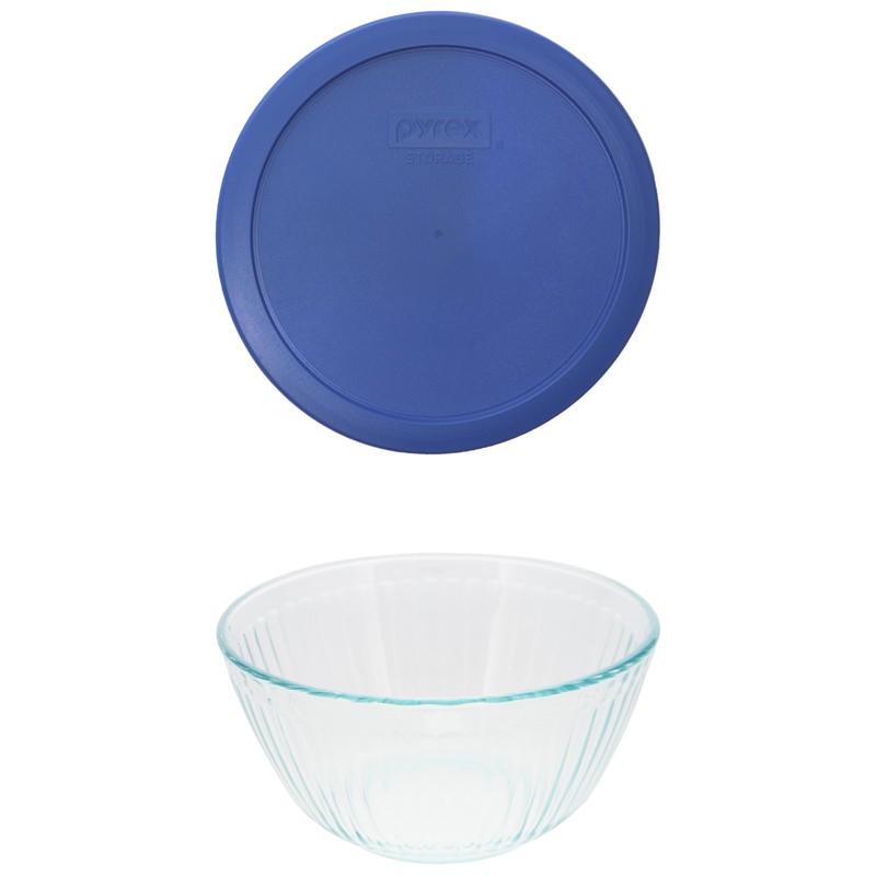 - Included: Pyrex (4) 7402 6-Cup/1.5L Sculpted Glass Mixing Bowls and (4) 7402-PC 6/7-Cup Amparo Blue Lids.