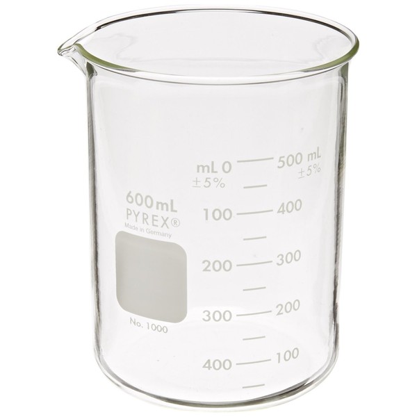 "600mL beaker, with spout, manufactured with uniform wall thickness, offers optimum balance between thermal shock resistance and mechanical strength. For convenience, these beakers have a double graduated metric scale to indicate approximate content and an extra large marking spot. For PYREX beaker covers, see Catalog No. 9985 or No. 9990. Reference: ASTM E-960. "