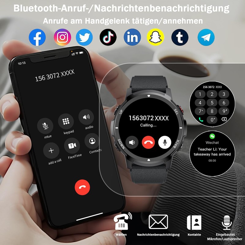 - Bluetooth call and message notifications: The Bluetooth smartwatch supports synchronization of over 99 mobile phone contacts, and you can make and answer calls directly on the smartwatch. In addition, you can also receive notifications from social applications such as Facebook, X, WhatsApp, etc., so you don't miss any important information