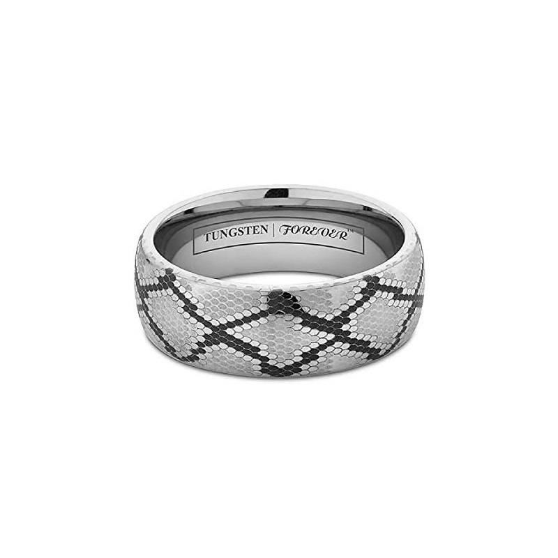 - Detailed snakeskin laser design is precisely placed on this smooth domed style tungsten ring to give it a unique slithering look fitting of its name.