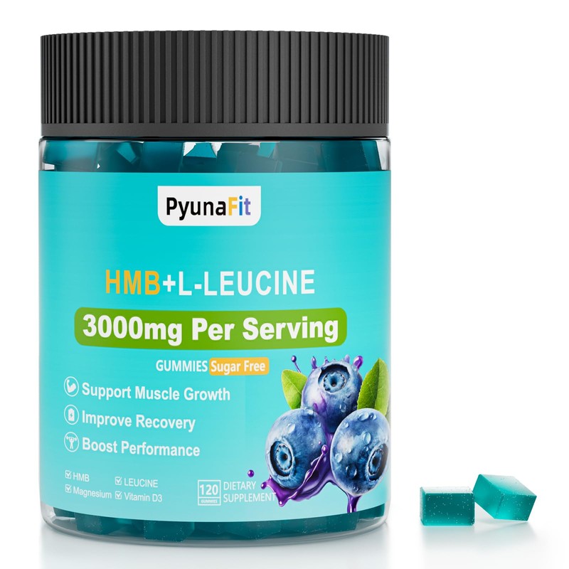 PYUNAFIT HMB Leucine Supplement Gummies, L-Leucine HMB with Vitamin D3 Magnesium Chewables for Men & Women, Amino Acid, Vegan, Sugar Free, 120 Count