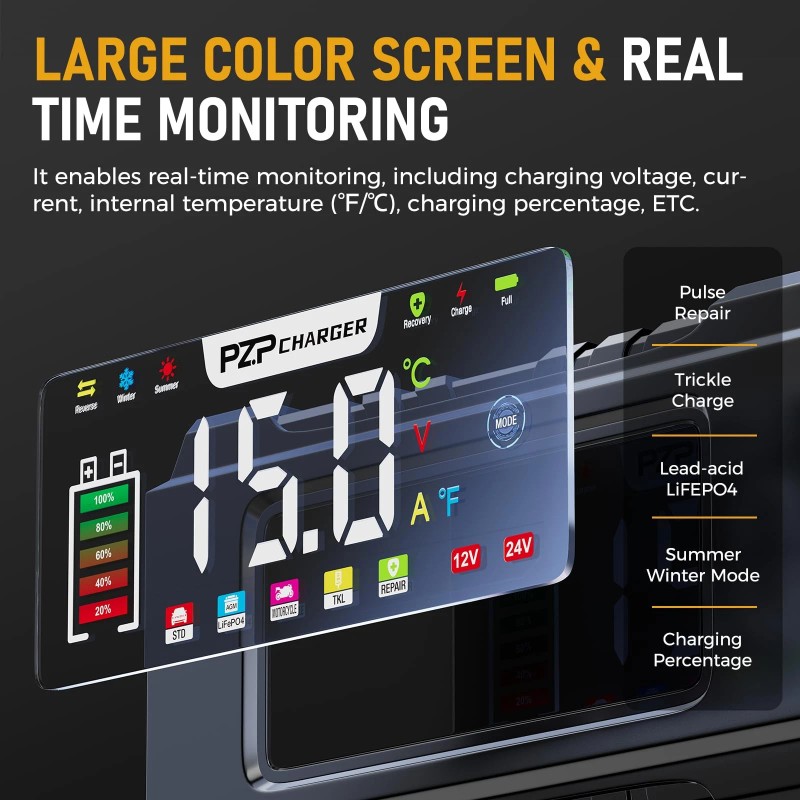 LARGE COLOR SCREEN & REAL TIME MONITORING - Color LED screen clearly displays essential charging data, including charging voltage, current, internal temperature (℉/°C), charge percentage, summer mode, and winter mode. Easily monitor your battery's status in real time, even in direct sunlight. The extended 6.7ft charging cable provides added convenience for hard-to-reach batteries.