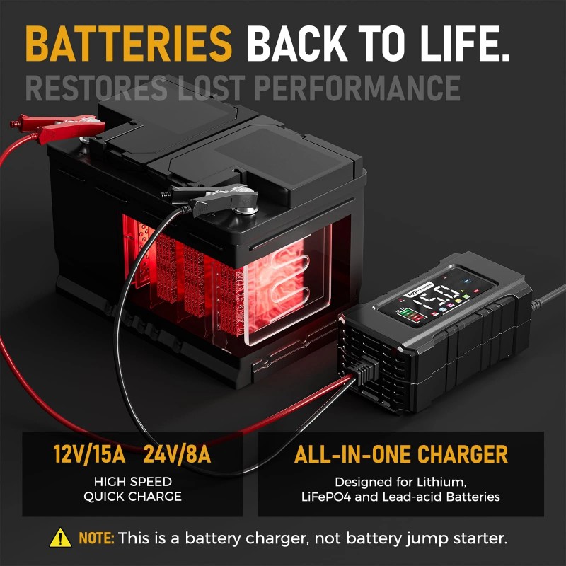 LiFePO4 LEAD-ACID SMART BATTERY CHARGER - 12V 15-Amp and 24V 8-Amp 9-stage quick battery charger, significantly faster than standard 10-Amp or 8-Amp chargers. Perfect for charging or repairing all 12V and 24V LiFePO4 and lead-acid batteries, including AGM, GEL, SLA, and Flooded types. Ideal for cars, trucks, SUVs, motorcycles, lawn mowers, boats, and marine applications. Note:(This is a battery charger not battery jump starter).